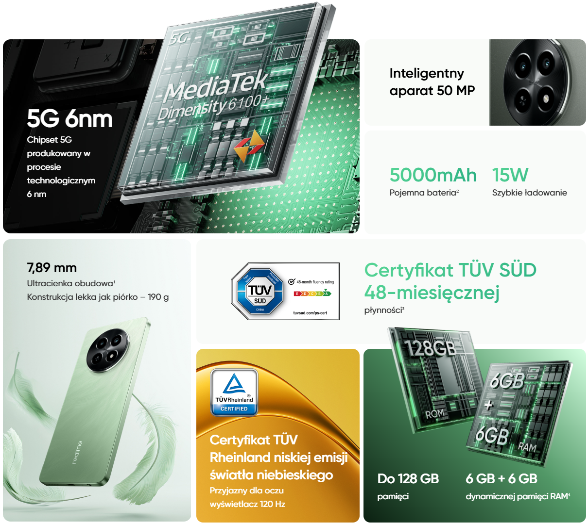 Smartfon realme 12X 5G jest napędzany zaawansowanym procesorem Dimensity 6100+ 5G, wspieranym przez technologię realme AI Boost, co zapewnia niezrównaną wydajność w swoim segmencie. Z certyfikatem TÜV SÜD 48-miesięcznej płynności, telefon gwarantuje 4 lata bezproblemowego użytkowania, ustanawiając nowy standard trwałości i niezawodności.